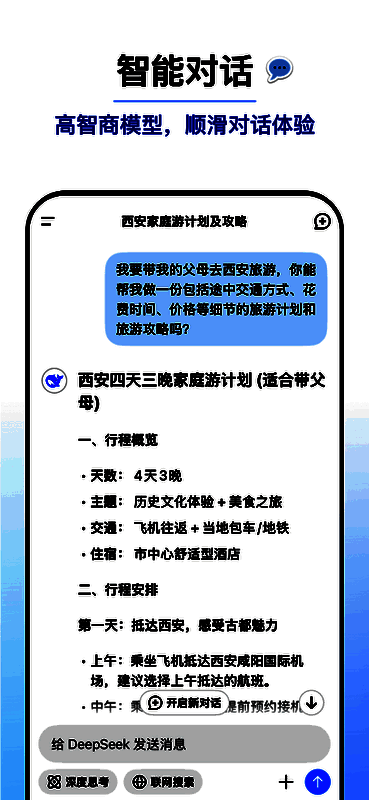 1. 深度思考:回答问题前生成内部思维链,逐步分析得出结论,借助DeepSeek高级推理模型保障答案准确且有逻辑性。