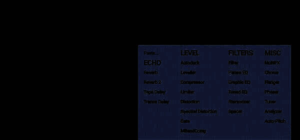 2. 包含所有效果模块:分析器(视觉)、自动闪避、自动音调(音调校正)、合唱、压缩器、限制器、失真、参数均衡器、图形均衡器、镶边、混响、调音器(吉他/人声/乐器)、高音 - 通/低通/带通/共振峰 (Vox)滤波器、延迟、移相器和立体声。