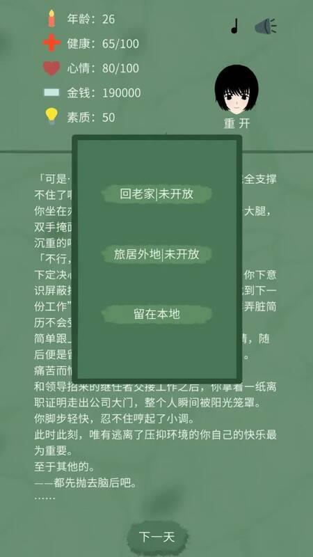 《裸辞人生模拟器》是文字冒险与角色扮演相融合的休闲游戏,玩家扮演裸辞后的角色,探索不一样的人生之路。