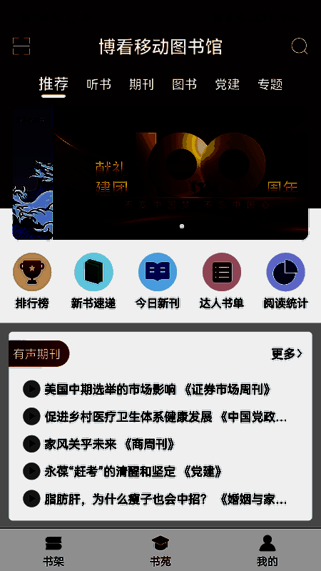 下载“博看书苑”APP,点击页面底部“我的”,注册登录并绑定机构授权码“jbxqlib”。