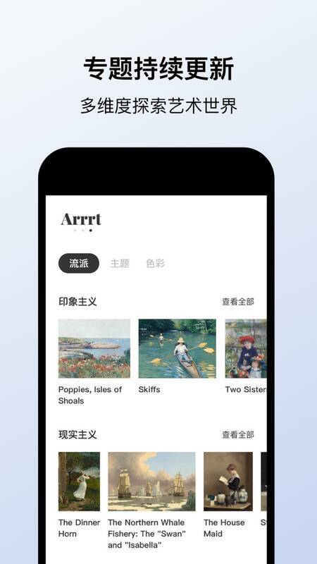 Arrrt安卓版是一款宛如便携式美术馆的应用,在这里,你能邂逅从巴洛克到抽象主义、从学院派到印象派、从文人画到浮世绘等丰富多样的艺术经典。中国编辑用心撰写并分享画作背后的理念、风格与故事,让艺术欣赏自然融入日常生活。向左滑动进入“专题”,可按流派、主题等多维度探索艺术世界;向右滑动到“我的”查看个人绘画收藏。每日更新精美画作,为手机桌面增添艺术气息。还能解锁全部画作,查看完整主题,下载高清名画,拥有专属艺术图标,尽情享受艺术之美,感兴趣的朋友别错过下载。
