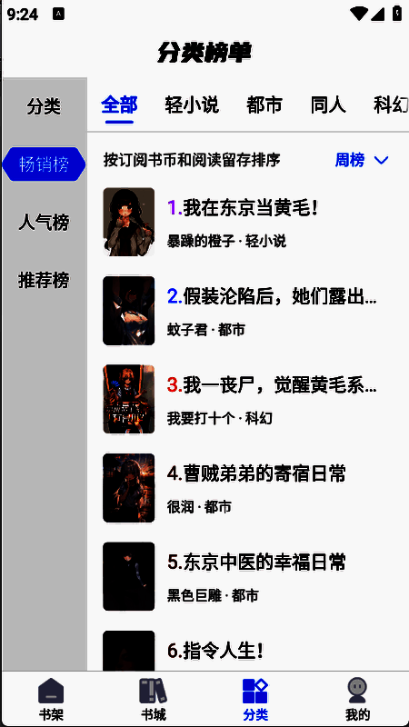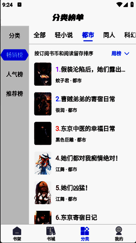 4、分类板块对小说进行细致划分,有都市、言情、科幻等多种类型。