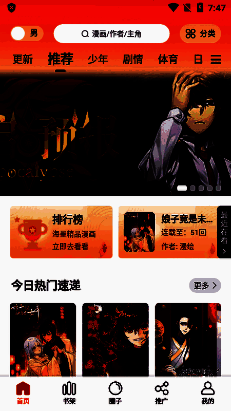 可缓存喜欢的漫画,零数据使用量追更。能阅读漫画评论,表达观点与朋友交流。免费下拉风格,通过分类和搜索能轻松找到喜欢的漫画,漫画类型丰富。