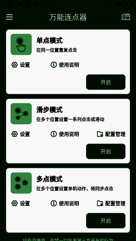 万能连点器手机版免费版是一款具备强大功能的任务连点软件。它有着智能的连点选项,用户能自由设置连点任务,畅享快速连点操作,享受顺畅服务体验。软件提供多样辅助功能,可完成便捷的连续点击,满足不同使用需求。用户还能自由修改连点模式。它能自动兼容多系统和平台。