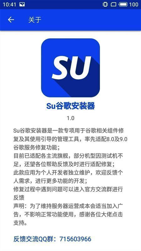 Su谷歌安装器三件套,是畅享谷歌全家桶的必备利器。有它之后,需要谷歌服务的游戏再也不会崩溃!它具备两种模式,能精准适配谷歌服务版本,有效修复谷歌服务。目前,该安装器兼容OPPO、VIVO、小米、华为、一加、魅族等主流机型,还支持Android 8.0和9.0谷歌服务安装,是值得信赖的谷歌安装程序。此外,它支持一键禁用/启用Google服务功能,可冻结Google服务后端功耗,也欢迎用户提供创意想法,定制集成管理工具。