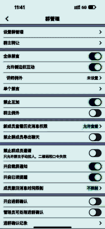 5、进入“设置”管理群员,随意调节禁言和撤回功能,让群秩序井然。
