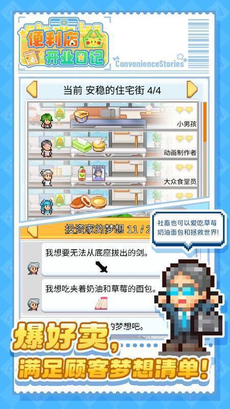《便利店开业日记》是一款经营模拟游戏,玩家扮演便利店老板,通过开启新的货架和引入新产品,来吸引更多顾客。借助促销活动培养回头客,定制特色产品,目标是打造最大的连锁便利店。
