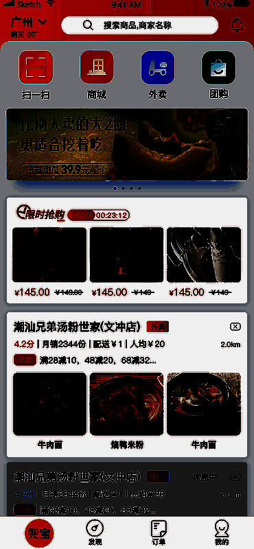 2、进入首页,可选择外卖、附近好店、活动专区、团购等服务。