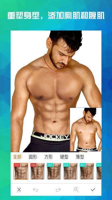 常有男生秀上半身照片显摆身材,现在有了Macho有型app,不用辛苦锻炼,一键就能拥有八块腹肌的有型身材,也能尽情秀。