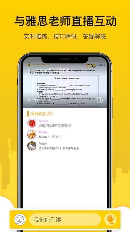 1、能与雅思老师进行直播互动,老师实时陪练,精准讲解技巧,随时答疑解惑;
