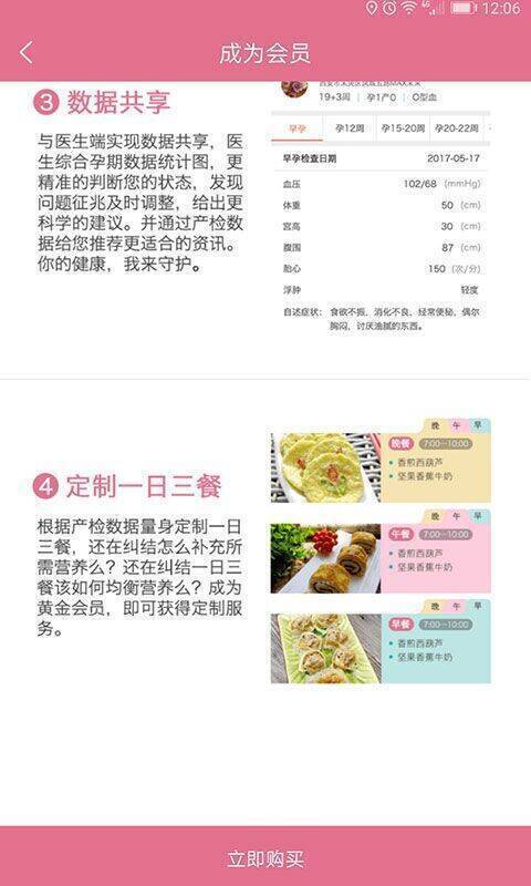 1. 按时提醒产检,有实用有趣的孕检漫画助你提前了解产检项目与注意事项;2. 提供孕期饮食指导,分析食物营养,每周推荐多样美味食谱及烹饪方法;3. 开展实用的孕期知识科普,消除孕期疑惑,助你健康度过孕期。