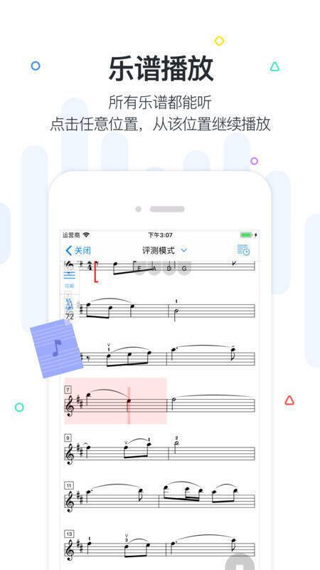 2、乐谱跟随:练琴时,应用会根据演奏者的节奏实时移动光标,自动翻滚乐谱。