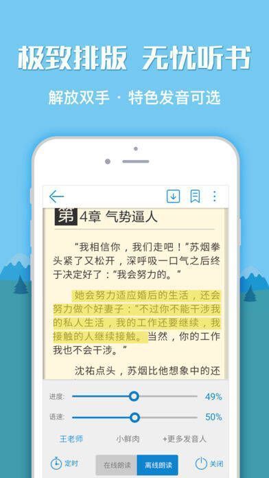 1、有声书频道,“声”临其境;2、一键听书,多种特色方言,解放眼睛满足耳朵;3、优化阅读体验,有仿真3D翻页等几十种细节呵护;4、支持多种排版布局个性化阅读,无网络也能阅读30多种文本格式。