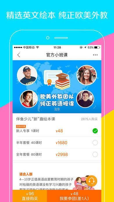 拥有国际领先的教学资源,搭配伴鱼的私人订制服务,能让孩子收获满满的成就感。平台聘请了获得国际认证的欧美外教以及优秀的中教,他们经验丰富、热情满满且善于互动。精心规划的课程体系,为孩子规划了合理的成长路径。老师会及时提供课下辅导,上课的回放也能随时复习。老师服务热情,还能提供个性化服务,而价格仅为线下机构的三分之一!