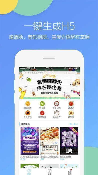 易企秀拥有海量精致的原创主题模板,涵盖婚礼请柬、节日贺卡、音乐相册、邀请函、个人简历、企业招聘、公司宣传、产品介绍、促销打折等常见内容,只需替换文字和图片就能生成酷炫的H5页面;