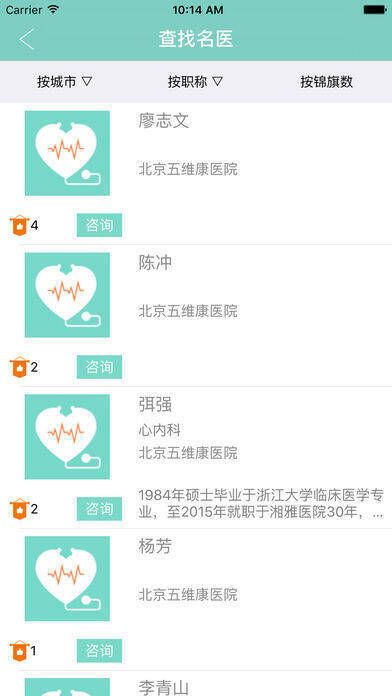 《找心电专家》是一款专为病人打造的 app。用户能够借助这款 app 与医生就病情进行咨询和交流。用户可查阅到的医生均是来自各大医院且自主注册该 app 的优秀医师,公司会对他们进行严格调查,审核通过后才可上线。
