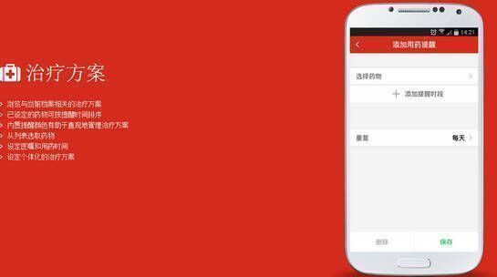 可浏览与当前档案相关的治疗方案,已设定的药物能按提醒时间排序,内置提醒颜色有助于直观地管理治疗方案,您能从列表选取药物,设定医嘱和用药时间,定制个体化的治疗方案。