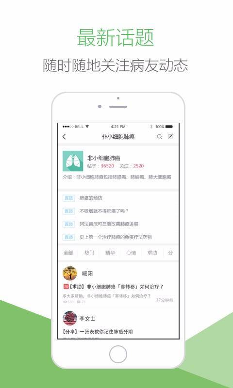 《肺癌帮》APP精准定位肺癌患者,作为中国首个肺癌患者APP,承载着广大患者的希望,关注患者所想所需,是抗击癌症的好帮手。