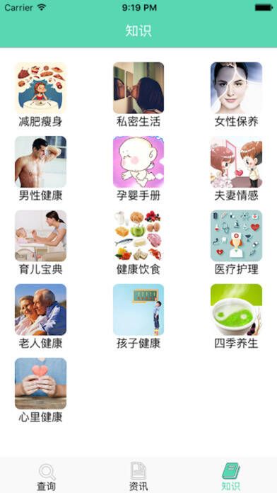 2、能查询健康生活知识,涵盖减肥瘦身、私密生活、女生保养、男性健康、健康饮食、育儿宝典、医疗护理、四季养生、心理健康等领域;