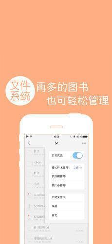 按目录方式管理图书文件,在目录里可进行搜索(可用关键词、拼音或首字母快速查找)、排序(可按文件名、大小、时间排序)、复制、移动、删除、新建文件夹、重命名、发送邮件(将选中文件通过邮件发送)、OpenIn(通过其他应用打开选中文件)、压缩文件和文件夹(把选中的文件和文件夹压缩成zip文件)。