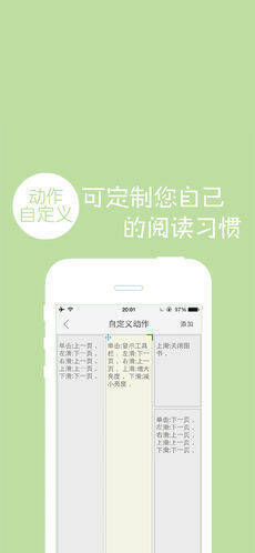 能在屏幕任意区域设置单指和双指的单击、左滑、右滑、上滑、下滑动作。动作类别有上一页、下一页、增大字体、减小字体、增大亮度、减小亮度、显示工具栏、添加或删除书签、打开目录列表、打开备注页、打开文本搜索页、打开解释收藏页、打开系统配置页、关闭图书、自动阅读、语音阅读。