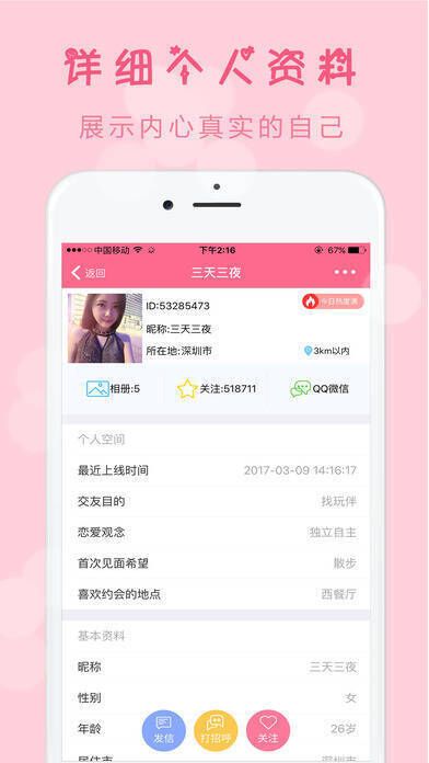 3、注册会员可以查看对方的年龄、身高、体型、学历、职业、收入、兴趣、相册、自我介绍等详细个人资料,方便你找到心仪对象。
