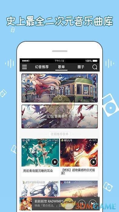 3D、动漫、中文、新番、游戏、纯音乐、燃曲、V家、鬼畜、人气唱见、东方、偶像、古风、摇滚、电子、和风、元气、同人翻唱等,只要是你想听的二次元音乐,这里应有尽有!