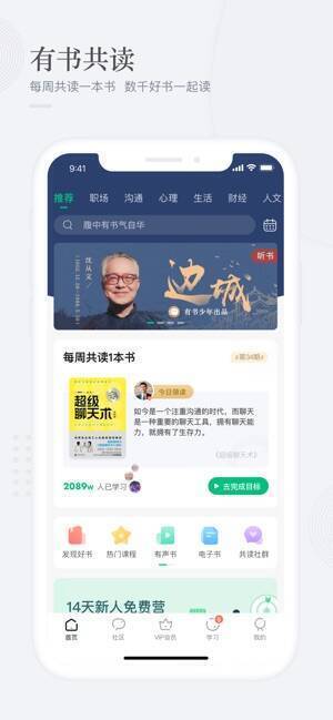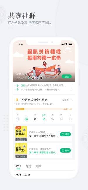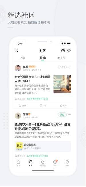 - 丰富的学习方式:有书快看(五分钟带你读完一本书)、大咖直播(业界热门知识类型直播)、有书众测(每月免费提供数百本实体书供用户评测)。