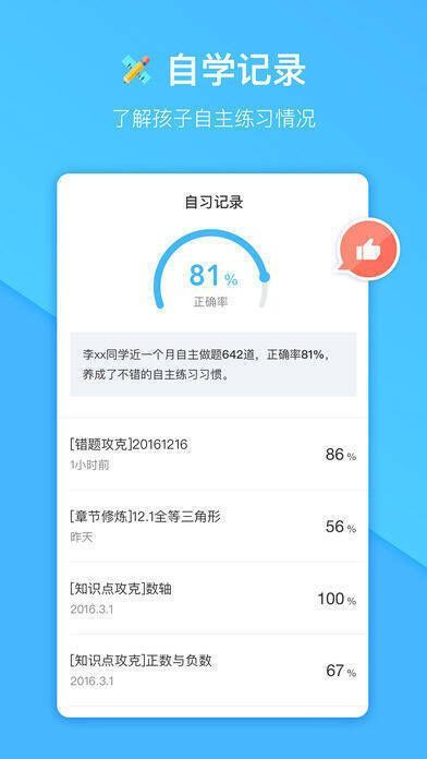 2、自学记录:能查看孩子近期除老师布置作业之外的练习情况,轻松参与孩子的日常学习。
