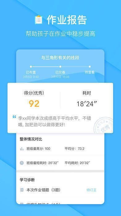 1、作业报告:可详细了解孩子的作业完成情况和知识点掌握程度,还有智能学习诊断,助力孩子在作业过程中逐步提升。