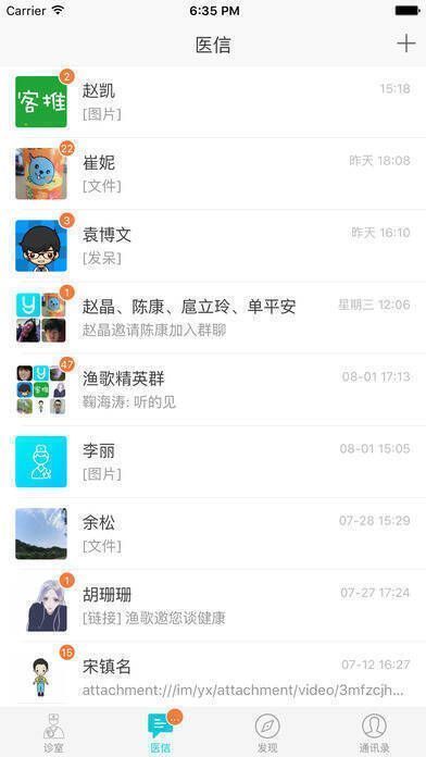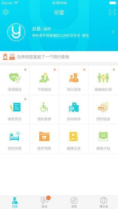【诊室/主页】有医生贴心的个人诊室,便于管理患者、消息、患者健康档案,还有双向转诊等功能;也有用户贴心的个人主页,可管理医生、消息、个人健康档案,还能查看记录健康信息。【医信】实现医疗即时通讯社交,医医、医患沟通方便。【发现】通过扫码扩大医疗社交圈。【通讯录】管理医患社交圈。