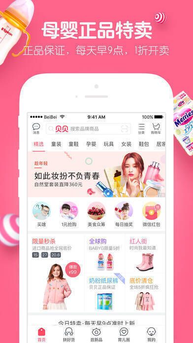 1、【品牌特卖】:每日精心挑选百家品牌开展限时特卖活动,专业买手严格把关,确保商品为正品且价格实惠,涵盖童装、童鞋、玩具、用品等各类商品。