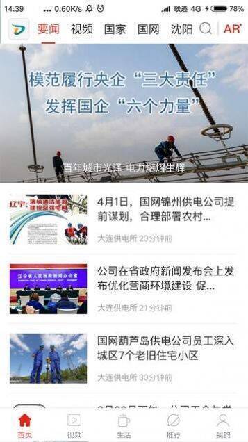 “辽电头条”移动应用平台有首页、视频、生活、推荐、我的五大功能模块,内容涵盖公司要闻、视频新闻等,满足融媒体要求。