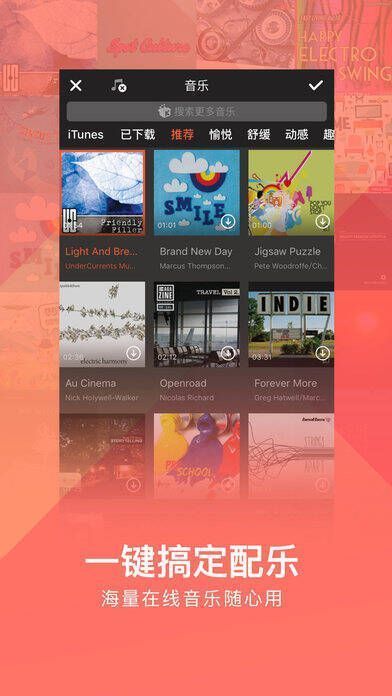 4、【一键搞定配乐】有多种配乐可选,如愉悦、舒缓等风格,还能自助选本地音乐,增添电影氛围。