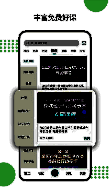 赛氪苹果竞赛社区是一款集大学竞赛查询与在线学习功能于一体的实用软件。它为全国高校搭建了一个多功能平台,可用于竞赛处理、活动参与以及校园文化事务发布。用户能在此参加各类专业认证的竞技比赛,还可在线观看短视频、查询和购买书籍、使用在线题库等。在线学习过程中,完成题目会实时记录,多样题型和短视频为比赛提供丰富知识,平台还提供众多比赛书籍助用户全面备赛,各类课程助力用户自信参赛。
