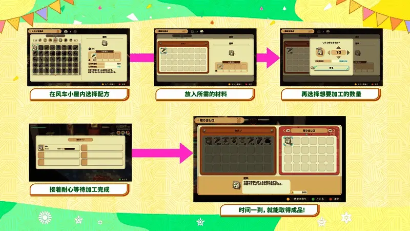 每座风车能加工的物品种类不同,修复后别忘确认加工项目,充分利用风车特性,提高牧场经营效率!
