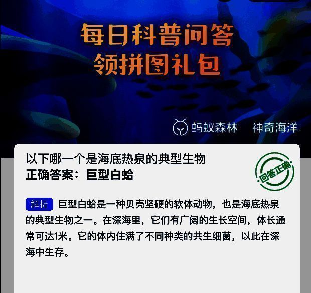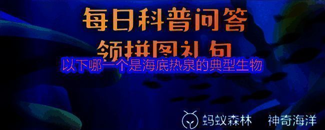 支付宝蚂蚁森林神奇海洋2025年6月17日问题已经更新,今日题目是:以下哪一个是海底热泉的典型生物?正确答案是:【巨型白蛤】。巨型白蛤是一种贝壳坚硬的软体动物,也是海底热泉的典型生物之一。