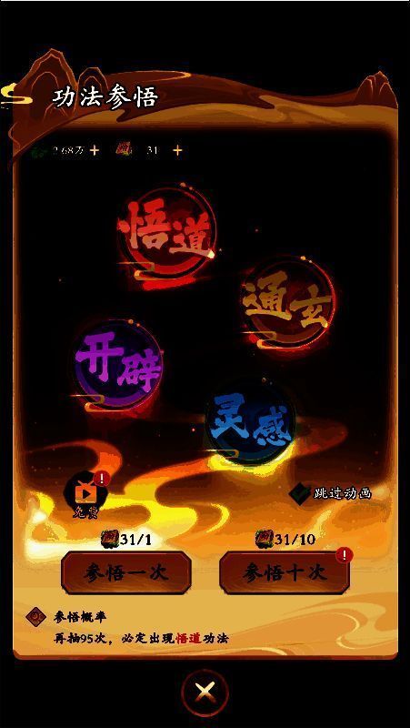 消耗功法要诀抽取功法,抽取一定次数后必得悟道级功法。