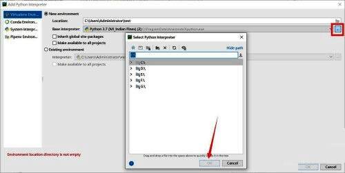 我们在弹出的窗口中,继续点击base interpreter后面的省略号按钮,选择Python3.7所在位置,确定后点击OK按钮。