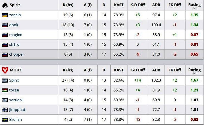 绿龙凭借donk在外场的肆虐表现统治了上半场,频频在MOUZ的开局默认中抓到人。老鼠能拿下4分实属幸运,这要归功于Spinx的一次4杀以及他们在eco局中对B点发起的几次变奏一波快攻。老鼠也受到了部分队员状态不佳的影响,xertioN和Brollan上半场两人加起来只拿到一个击杀。