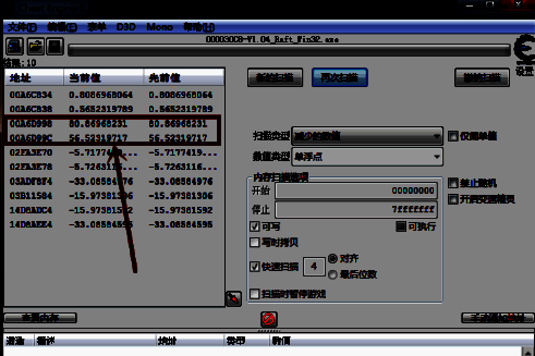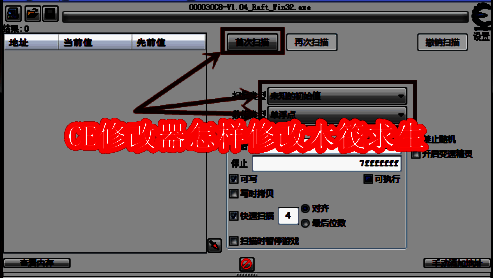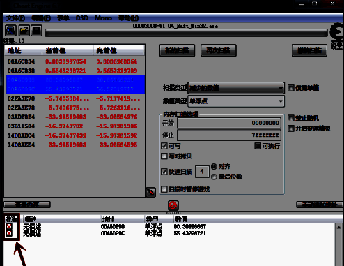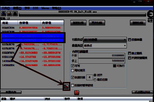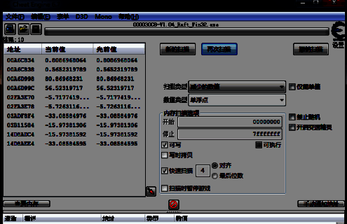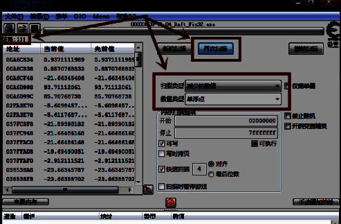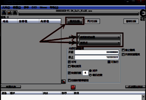 搜索栏下方的扫描类型选择未知的初始值,下方的数值类型选择单浮点,点击首次扫描。