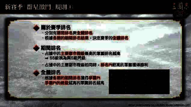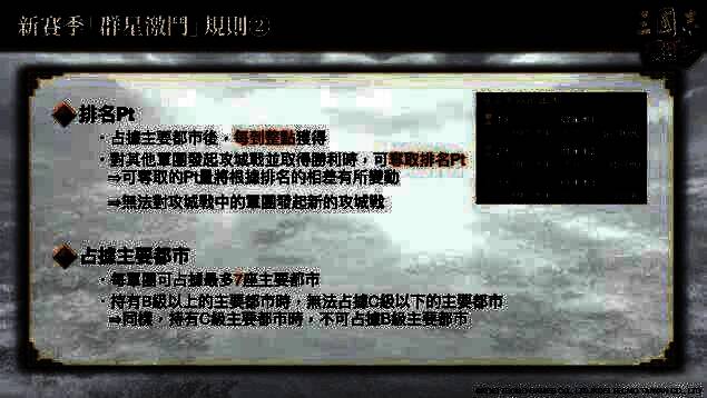 6月19日(四)新赛季「群星激斗」开战。玩家可以在攻城战借助独立行动NPC「英杰」的力量进行战斗。借助英杰的力量时需要使用「战缘」,战缘可以藉由击败地图上强力的NPC「英杰队」获得。英杰有著各式各样的能力,第一期将有马超、郭嘉、甘宁等共9位英杰登场。此外,排名将以军团为单位,分为各赛季的排名和整体排名两种。各赛季排名将竞争佔领的主要都市最高阶级和排名点数。整体排名将比较随各赛季排名获得的争霸点数。
