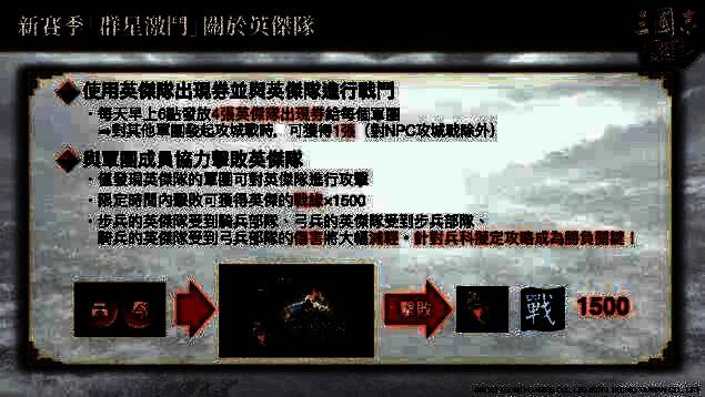 新赛季「群星激斗」开战。玩家可以在攻城战借助独立行动的NPC「英杰」的力量进行战斗。借助英杰的力量时需要使用「战缘」,战缘可以藉由击败地图上强力的NPC「英杰队」获得。英杰有著各式各样的能力,第一期将有马超、郭嘉、甘宁等共9位英杰登场。