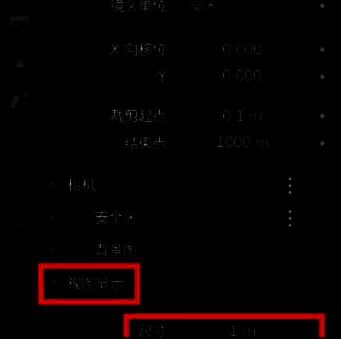 在相机设置界面中,点击“视图显示”选项,并拖动“尺寸”选项,拖动即可更改摄像机的尺寸大小。