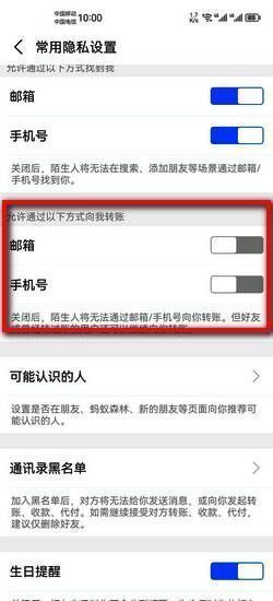 4、最后将允许通过以下方式向我转账下的邮箱和手机号关闭即可。
