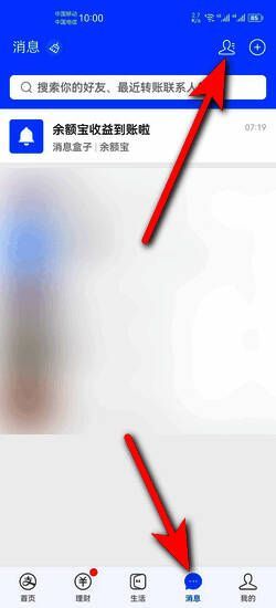 5、也可在支付宝消息页面点击右上方的好友图标。