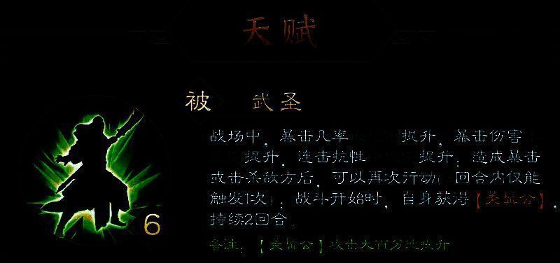 战场中,暴击几率大比列提升,暴击伤害小比例提升,连击抗性中比例提升,造成暴击或击杀敌方后,可以再次行动(3回合内仅能触发1次);战斗开始时,自身获得【美髯公】,持续2回合。