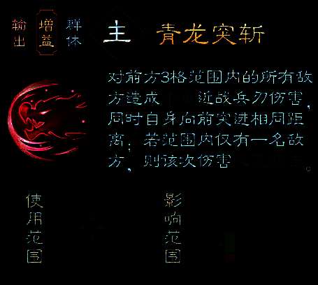 对前方3格范围内的所有敌方造成中量近战兵刃伤害,同时自身向前突进相同距离,若范围内仅有一名敌方,则该次伤害义定暴击。