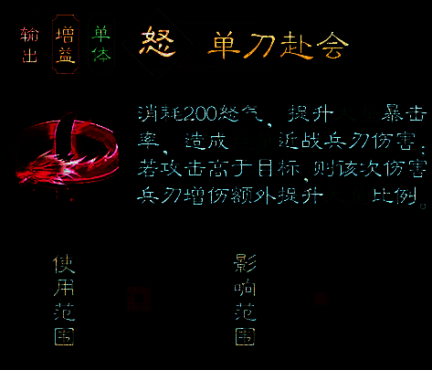消耗200怒气,提升大量暴击率,造成巨量近战兵刃伤害;若攻击高于目标,则该次伤害兵刃增伤额外提升大量比例。