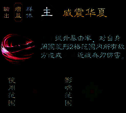 大量提升暴击率,对自身周围菱形2格范围内所有敌方造成少量近战兵刃伤害。